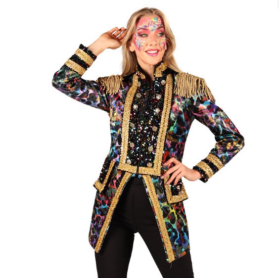 Met deze kleurrijke carnavalsjas ben jij het stralende middelpunt van elk feest! De jas is afgewerkt met een luxe combinatie van glinsterende zwarte pailletten, gouden biezen en opvallende schouderfranjes, wat zorgt voor een elegante en feestelijke uitstraling.
