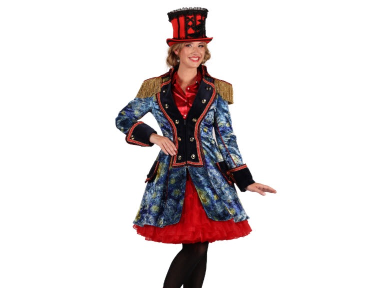 Steel de show met deze prachtige damesjas! De jas heeft een schitterende blauwe oceaan print op een zachte fluweel, gecombineerd met een contrasterende zwarte stof met rood galon en mooie knopen. De luxe epauletten met gouden franjes en de brede manchetten maken van deze jas een chique en feestelijk statement! Een echte eyecatcher! Aan de voorzijde zit een praktische rits. Perfect voor carnaval, themafeesten of extravagante gala's. Mooi te combineren met een petticoat en hoge hoed.